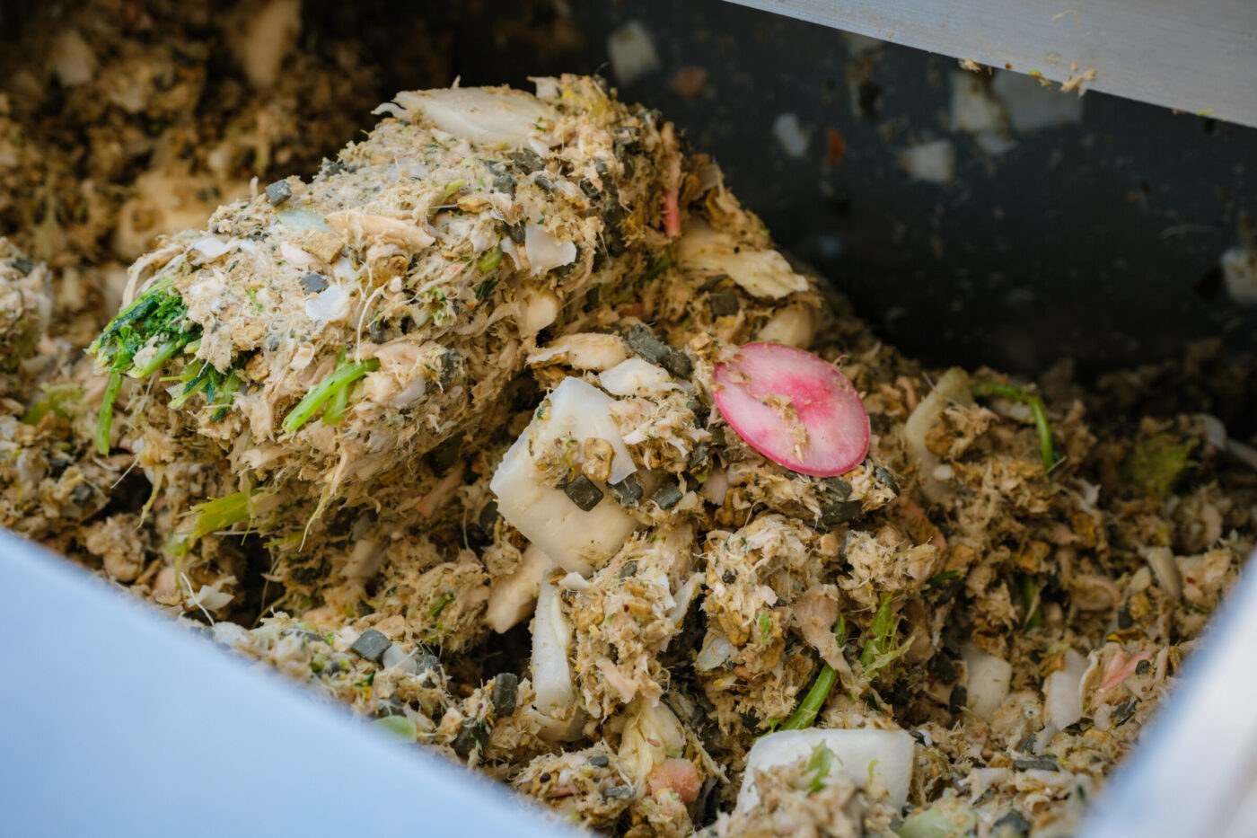 もりをはじめ食品メーカーにとって大きな課題は産業廃棄物「食品残さ」の処理です。食肉の骨、魚介の殻など食品素材から発生する生ごみは水分を多量に含んで非常に重く、焼却の際には多くのエネルギーを必要とします。また、燃焼に時間がかかり、CO2の排出量も増え、環境によくないとされています。