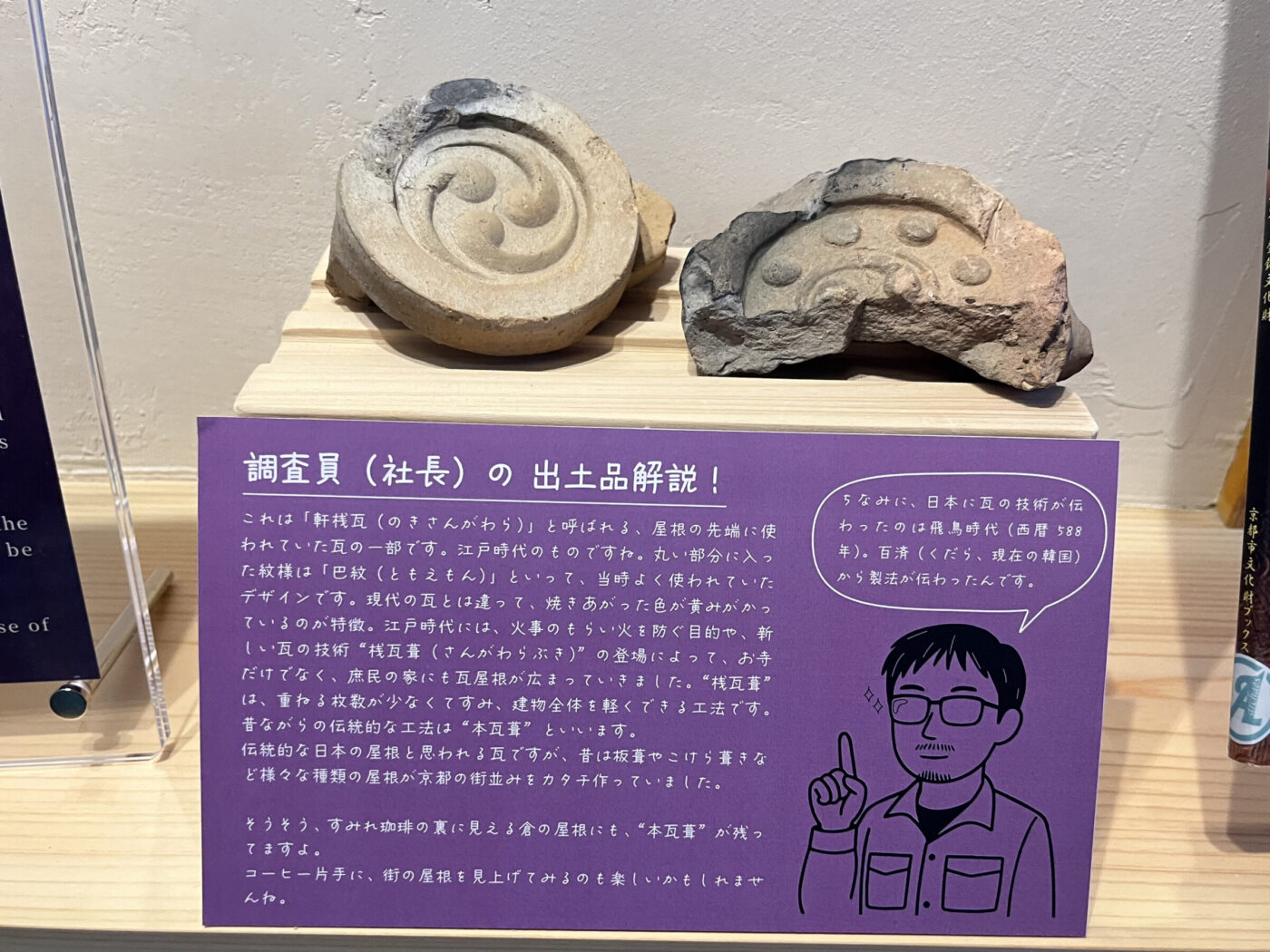 お店のコンセプトは「博物館未満、日常以上」。店内には発掘や土器にまつわる資料や本があるほか、解体作業中に見つかった土器も社長の解説付きで展示。まさにここが発掘場所であることから、「すみれ遺跡」とも名付けられています。