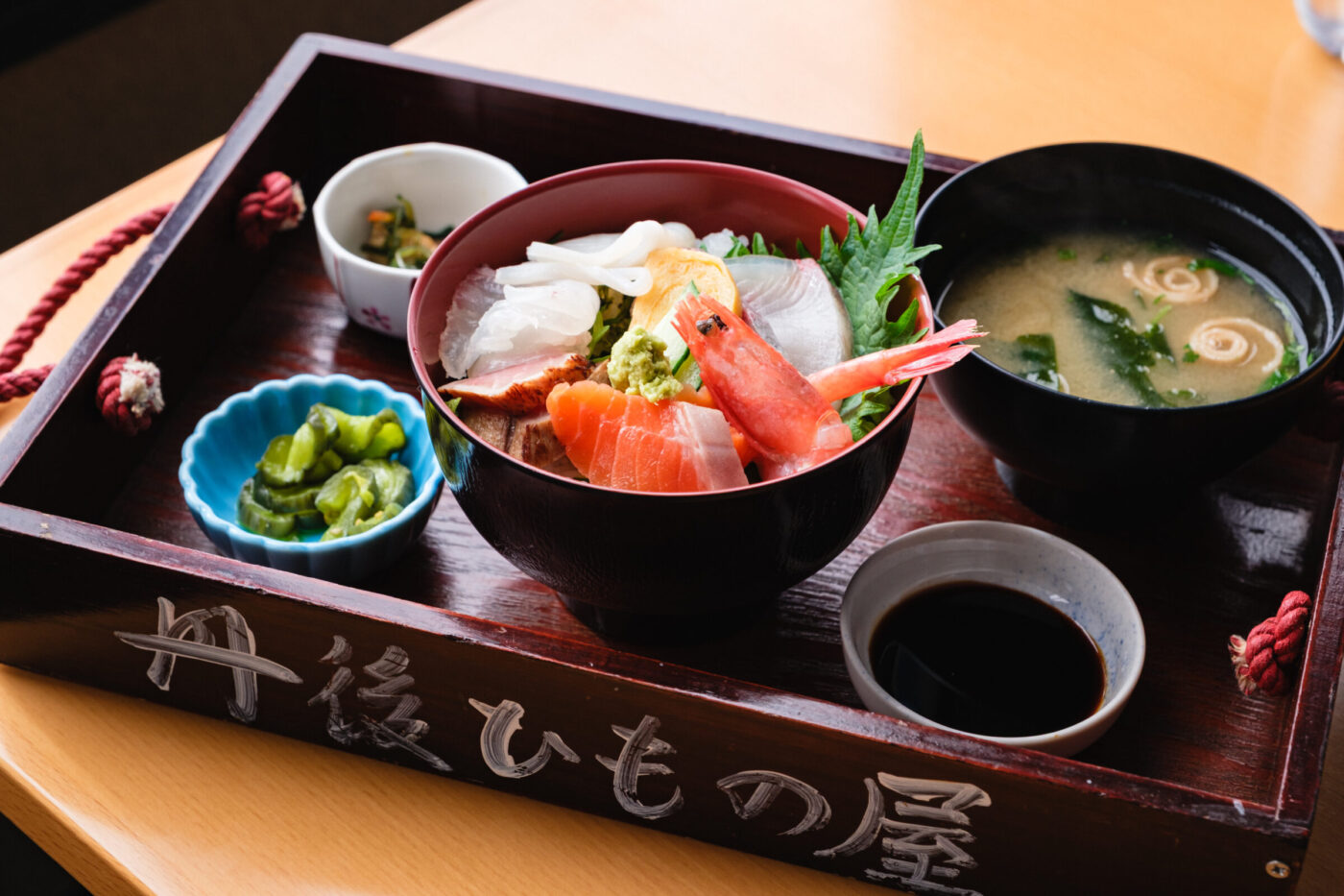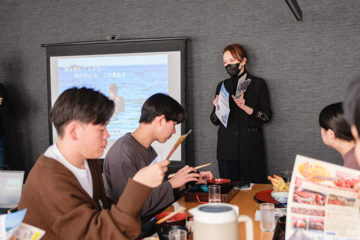 発表の後は、「丹後ひもの屋」で海鮮丼ランチ。併設する宿泊施設「水屋敷」を拠点に活動している「京丹後こども・みらいプロジェクト」について、女将の小谷奈穂(おだに・なほ)さんから紹介していただきました。