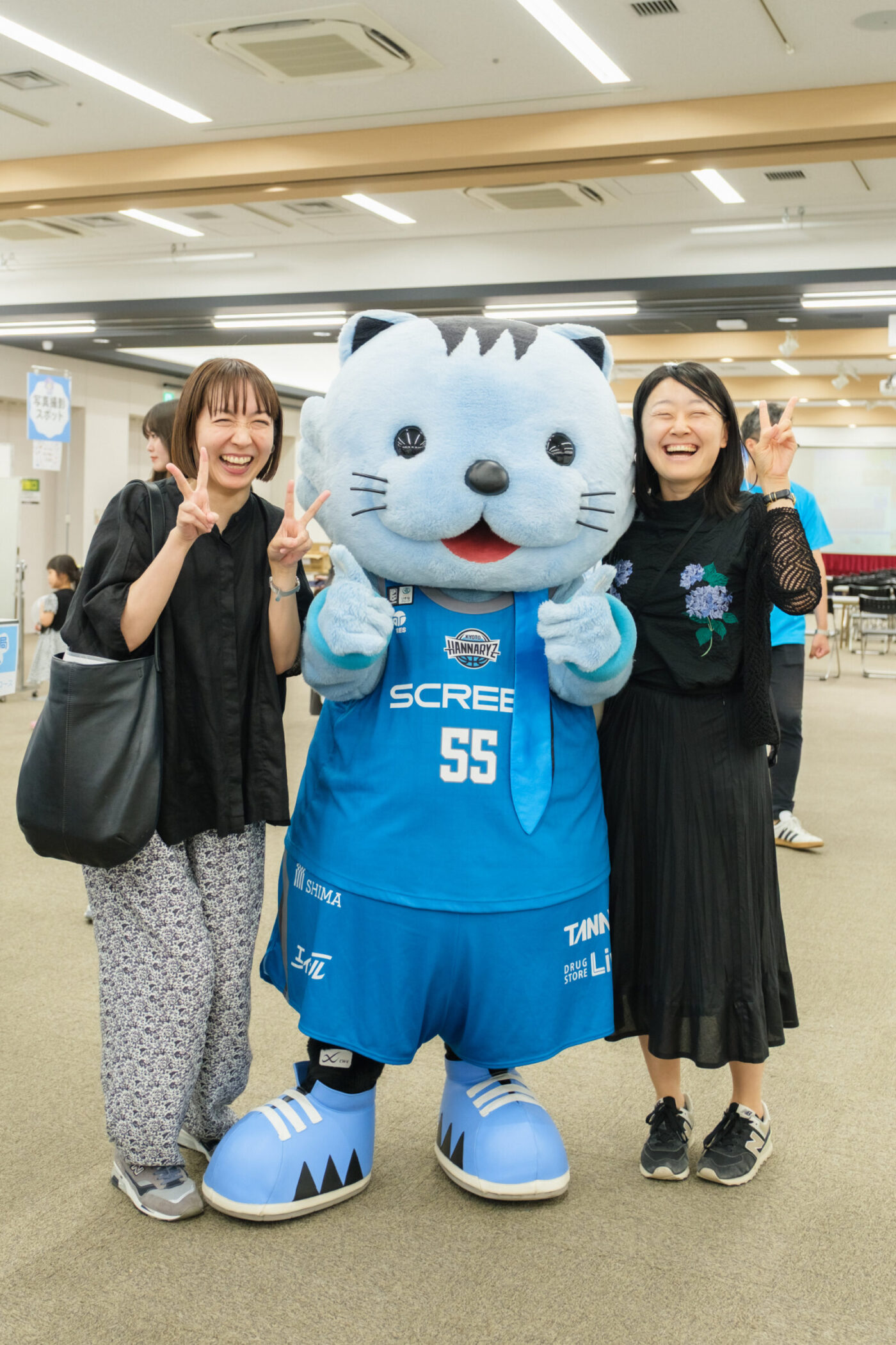 写真は、京都ハンナリーズのマスコットキャラクター「はんニャリン」と記念撮影できて、ほくほく笑顔の取材チームです。