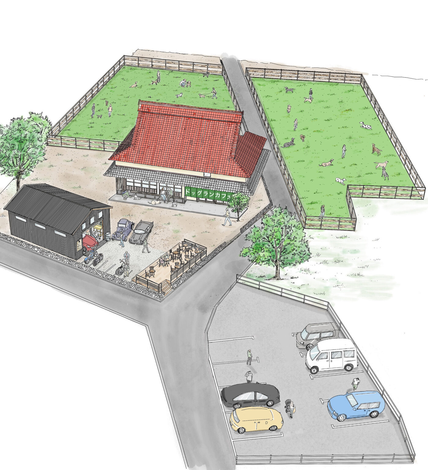 例えば「ドッグラン&古民家カフェ」はいかがでしょう。広大なスペースを犬さん等が楽しそうに駆け回る姿が想像できますね。大型犬と小型犬とを分けて運用できるドッグランスペースも確保できそうです。駐車スペースもバッチリとれますね。