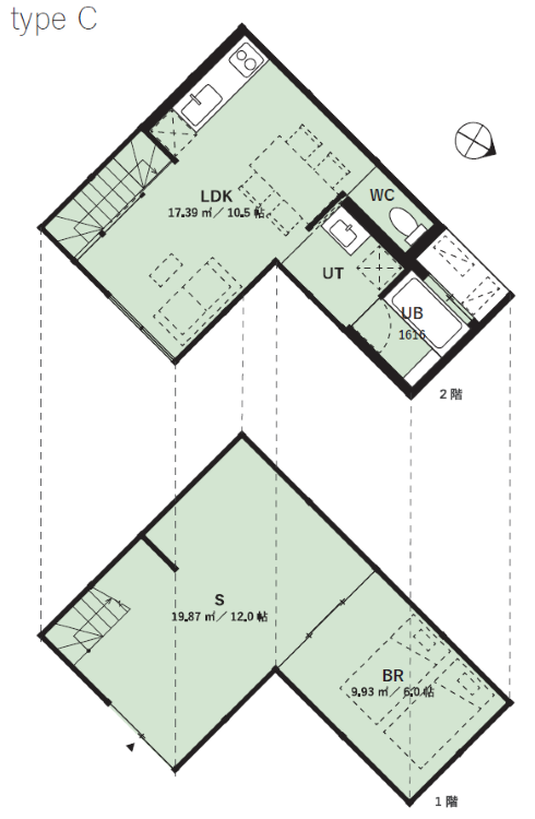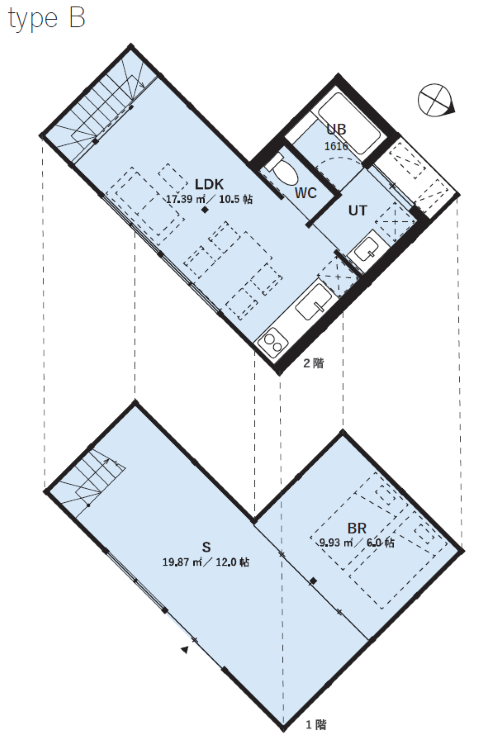 まずtypeAは職住一体の「住」に重きを置いた区画となっており、1階の店舗スペースは小ぶりなぶん、2階にリビングと寝室・水回りを設けて複数人での住まい利用が期待されます。
