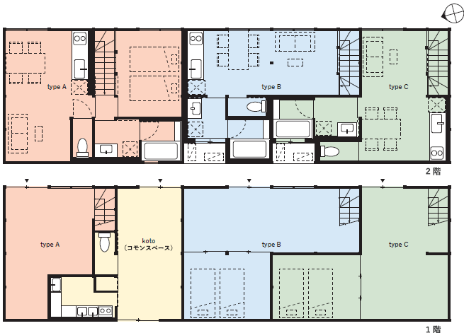 これに加え、ココナガヤではAとBの間に「コト」というコモンスペースを設けており、入居者はもちろん、地域の方も外部の方も予約制で借りられるようになります。
