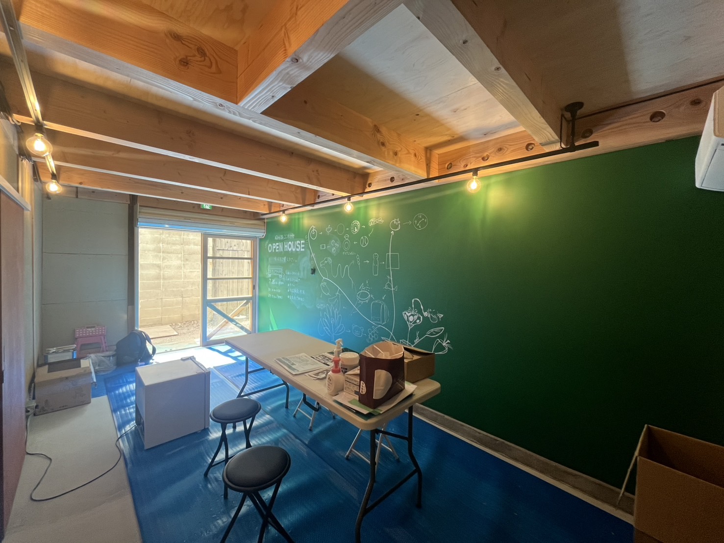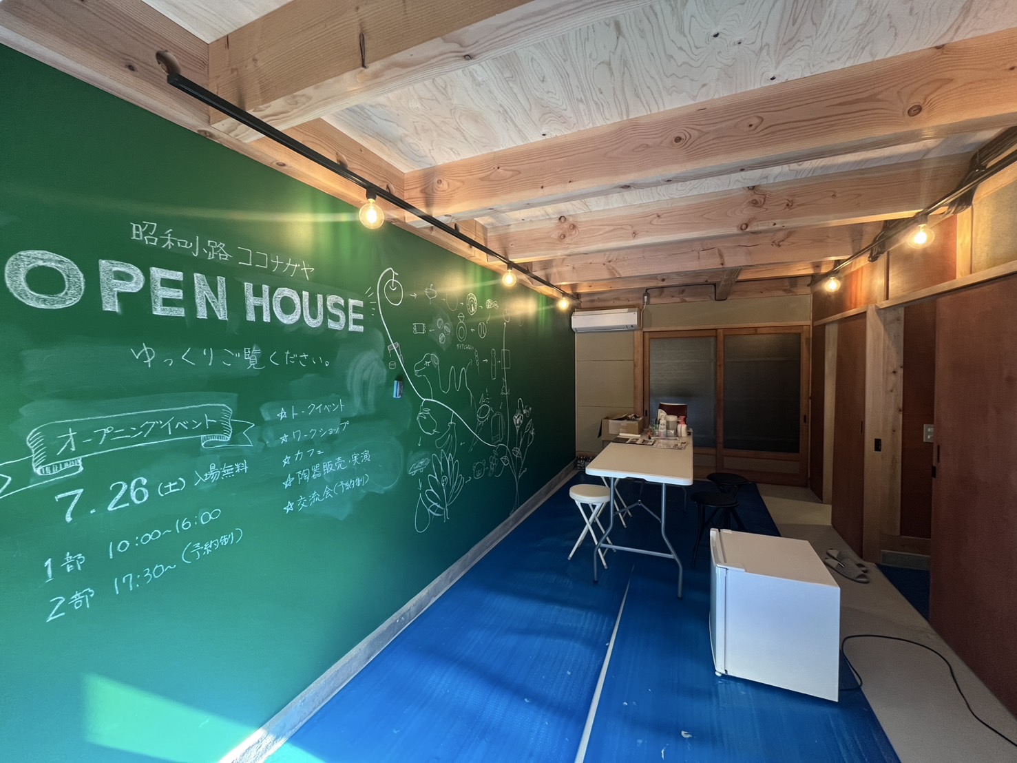 壁一面が黒板となっているので、住人やコト利用者の情報交換に役立ちそう。