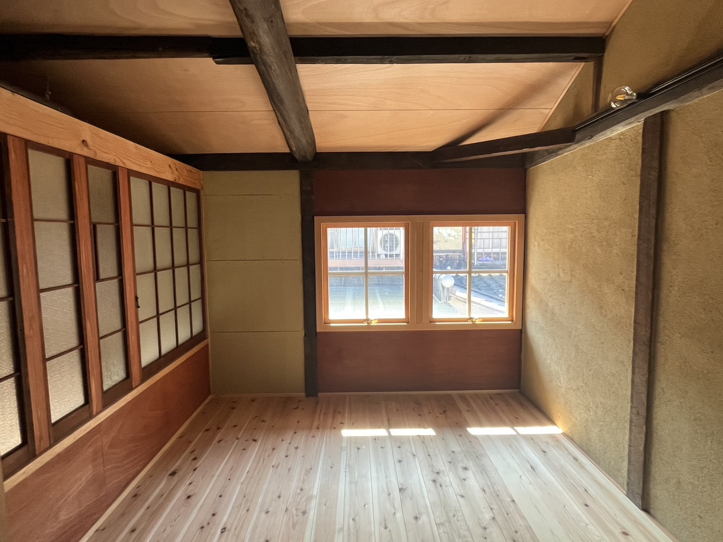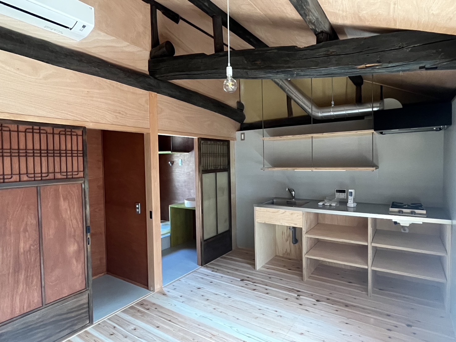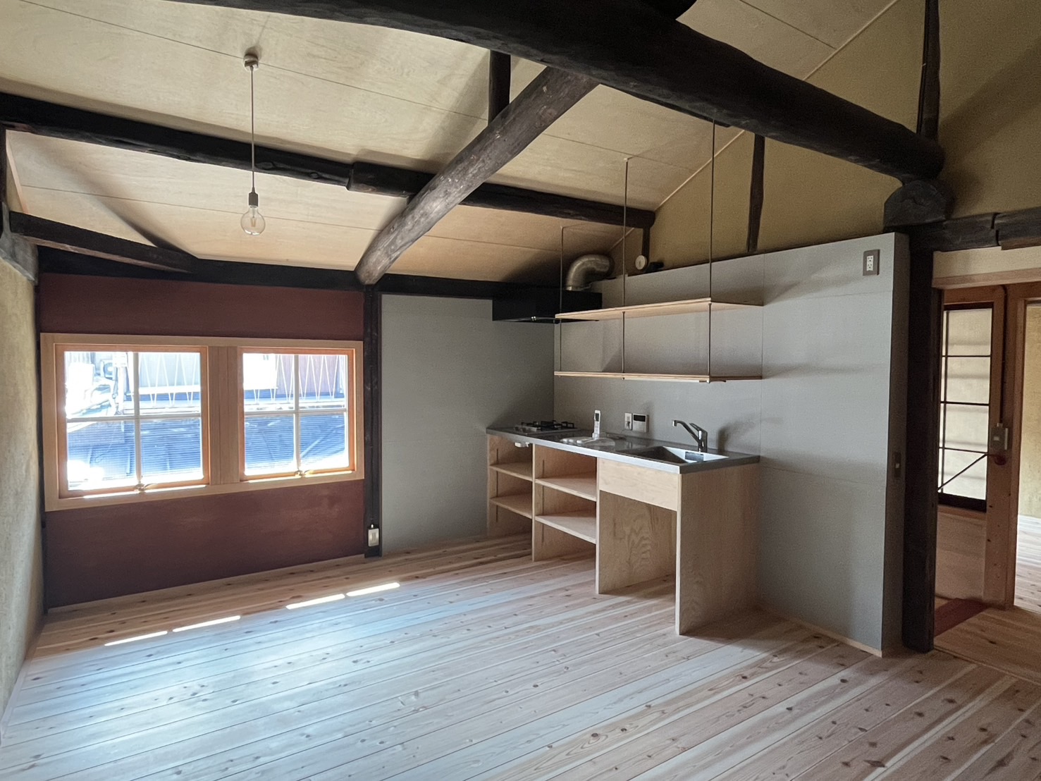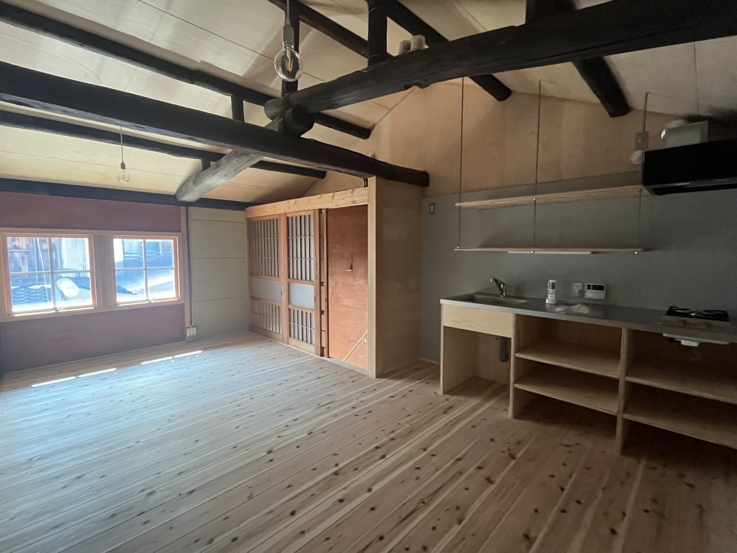 typCはココナガヤの一番奥に位置するため、3部屋の中で唯一、工房利用も相談可能となっています。1階のL字に奥まった部分を作品のストックや材料の倉庫として利用するなどはいかがでしょうか。