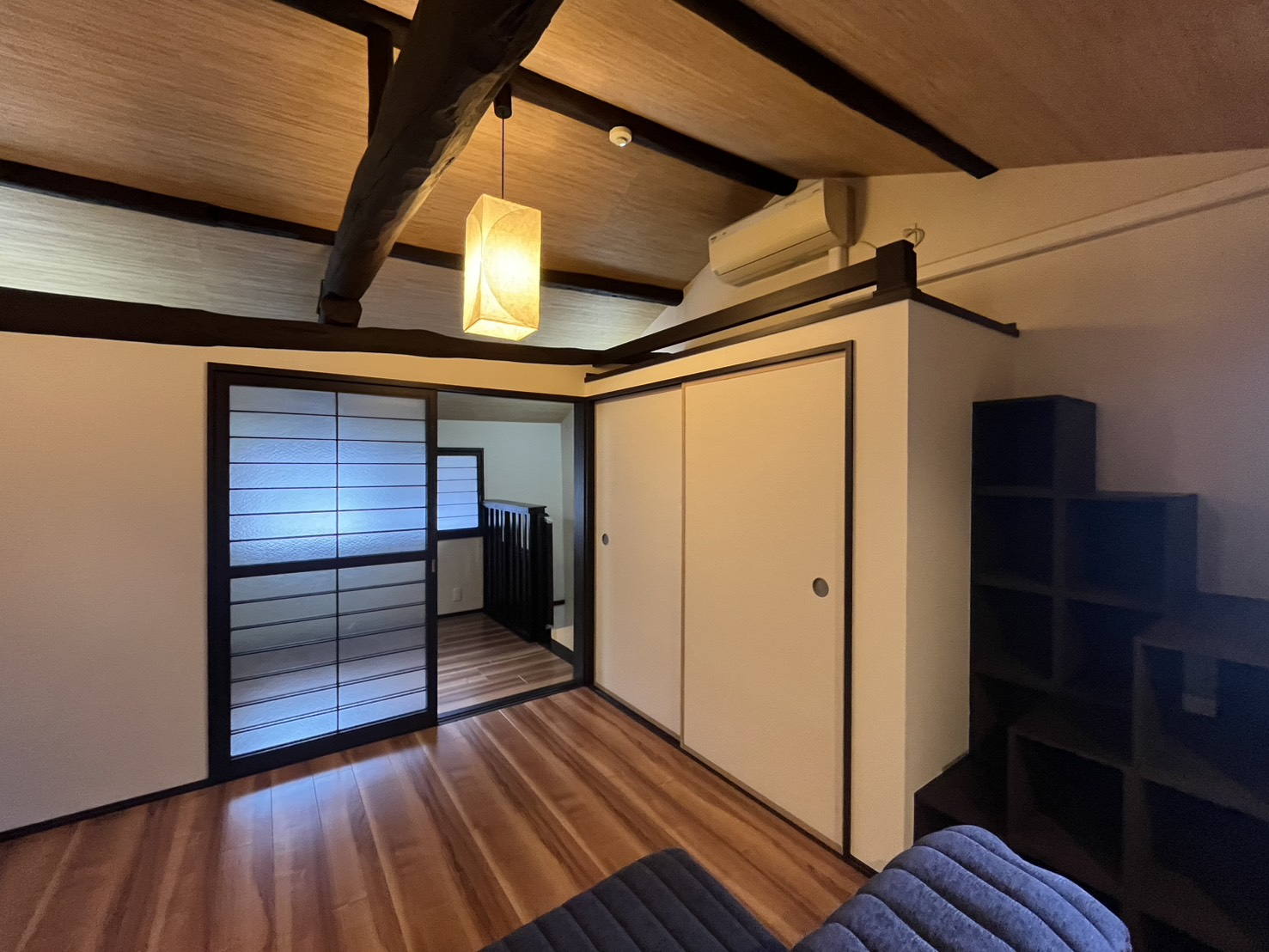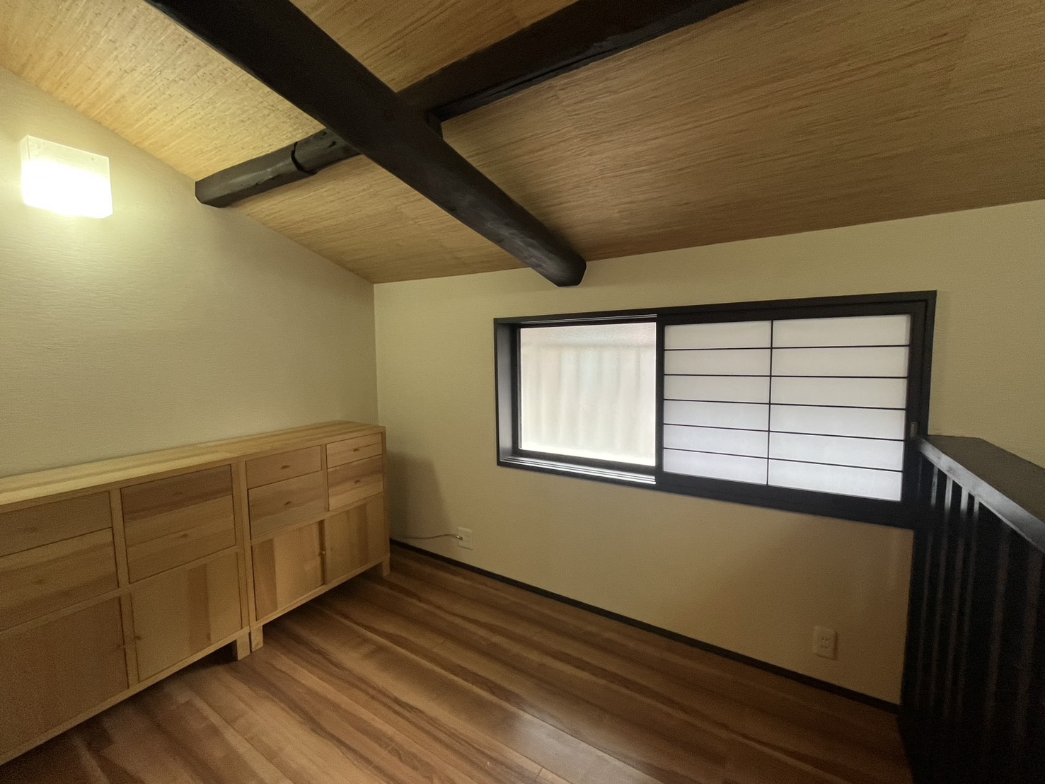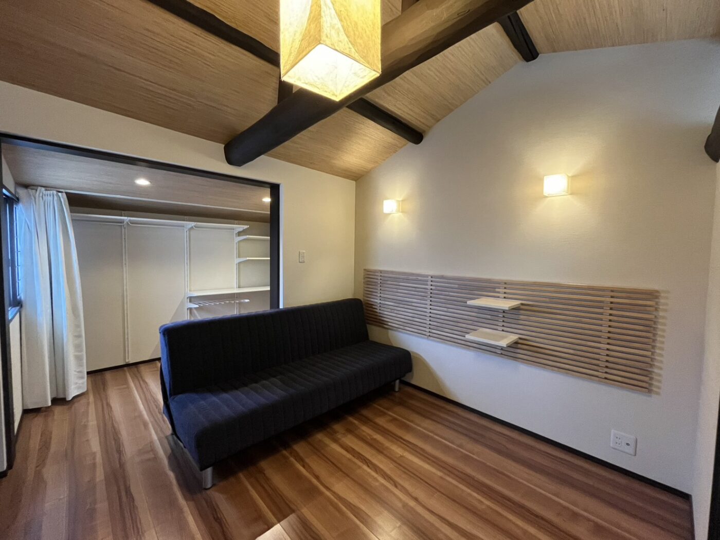 2Fは2部屋あり、階段を上がってすぐのスペースと、奥にはベッドルーム兼ウォークインクローゼットのような空間があります。梁が見えて和モダンなしつらえです。
