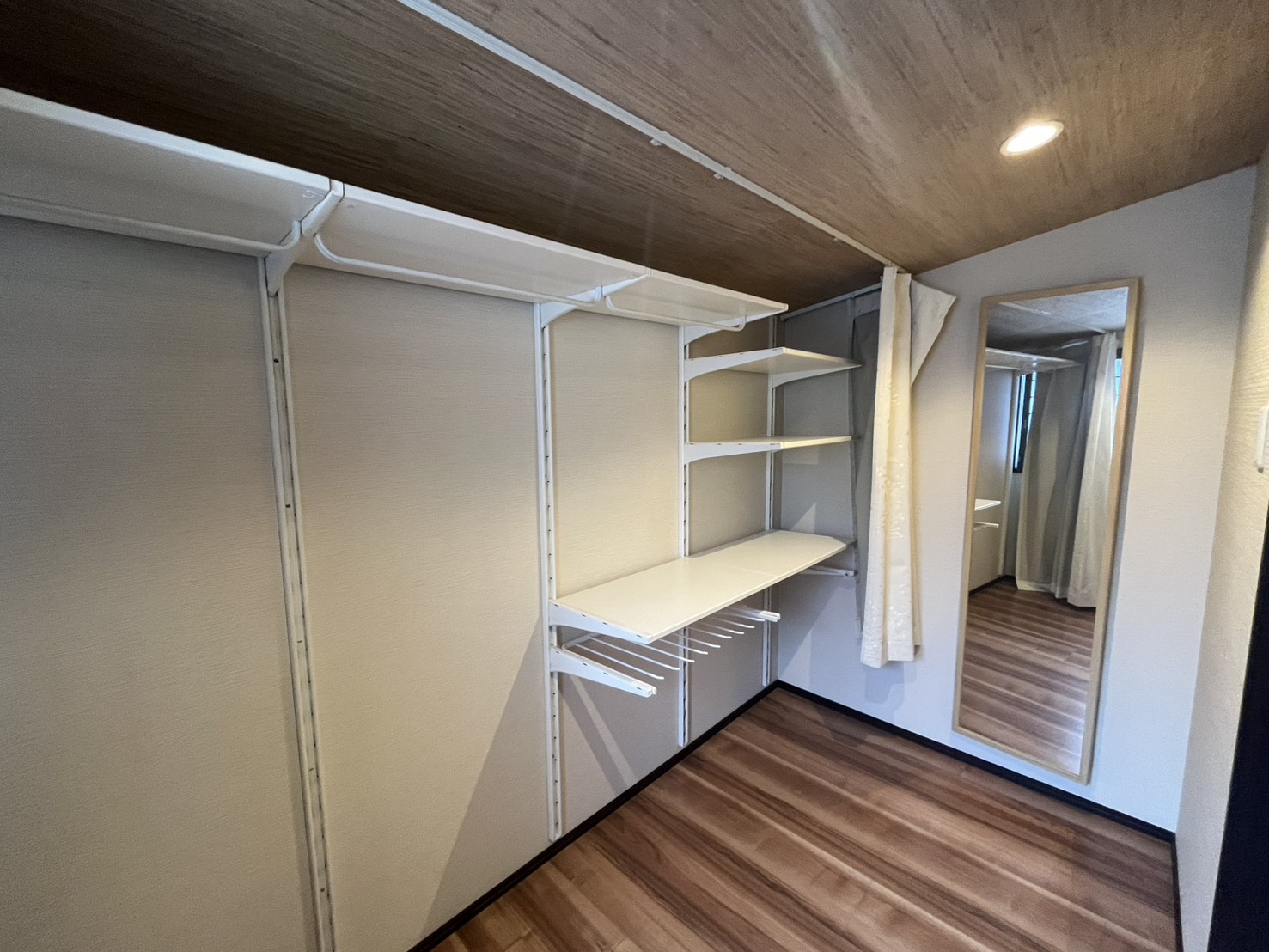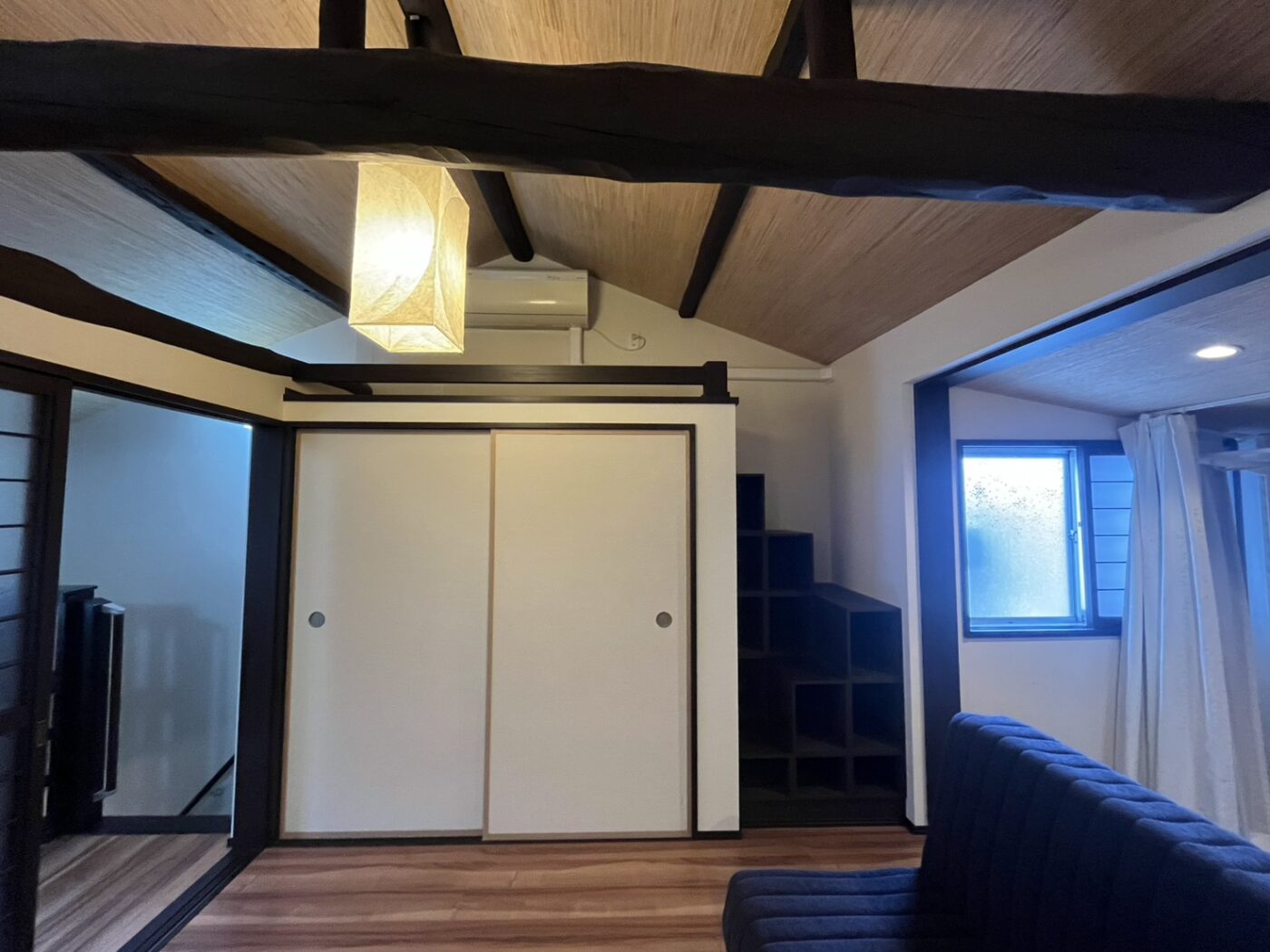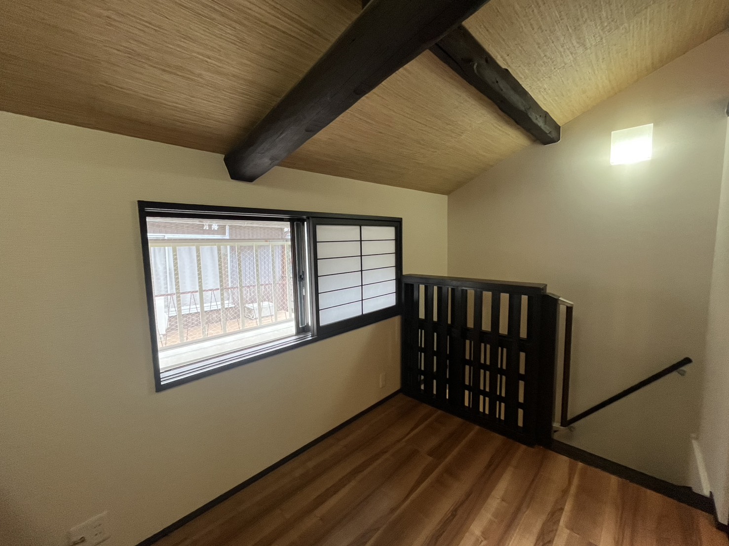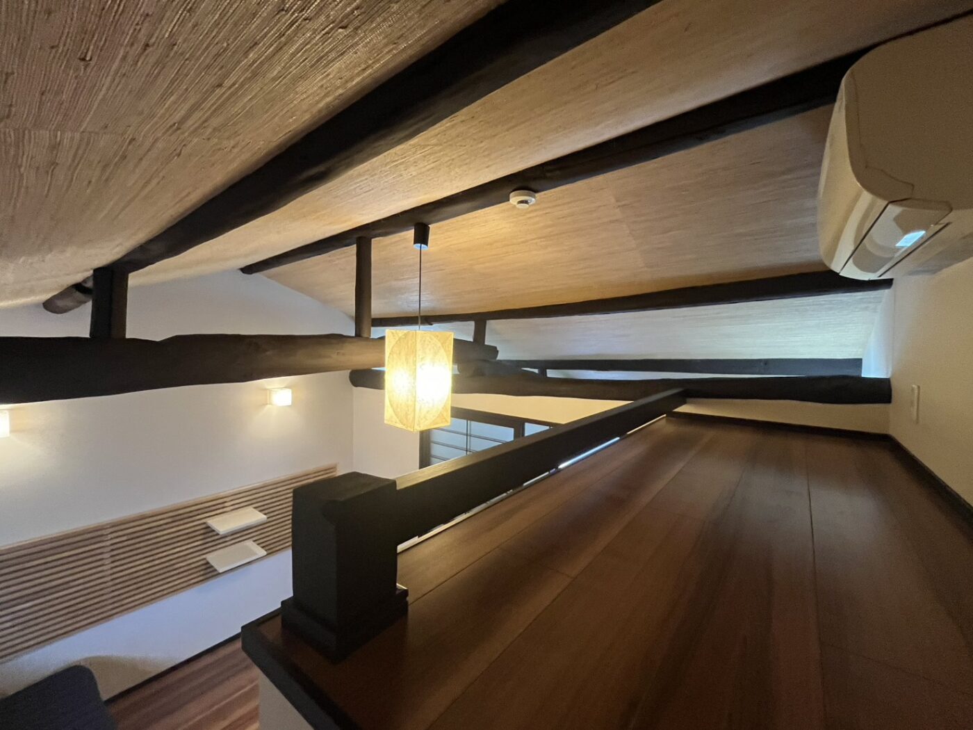 2Fは2部屋あり、階段を上がってすぐのスペースと、奥にはベッドルーム兼ウォークインクローゼットのような空間があります。梁が見えて和モダンなしつらえです。