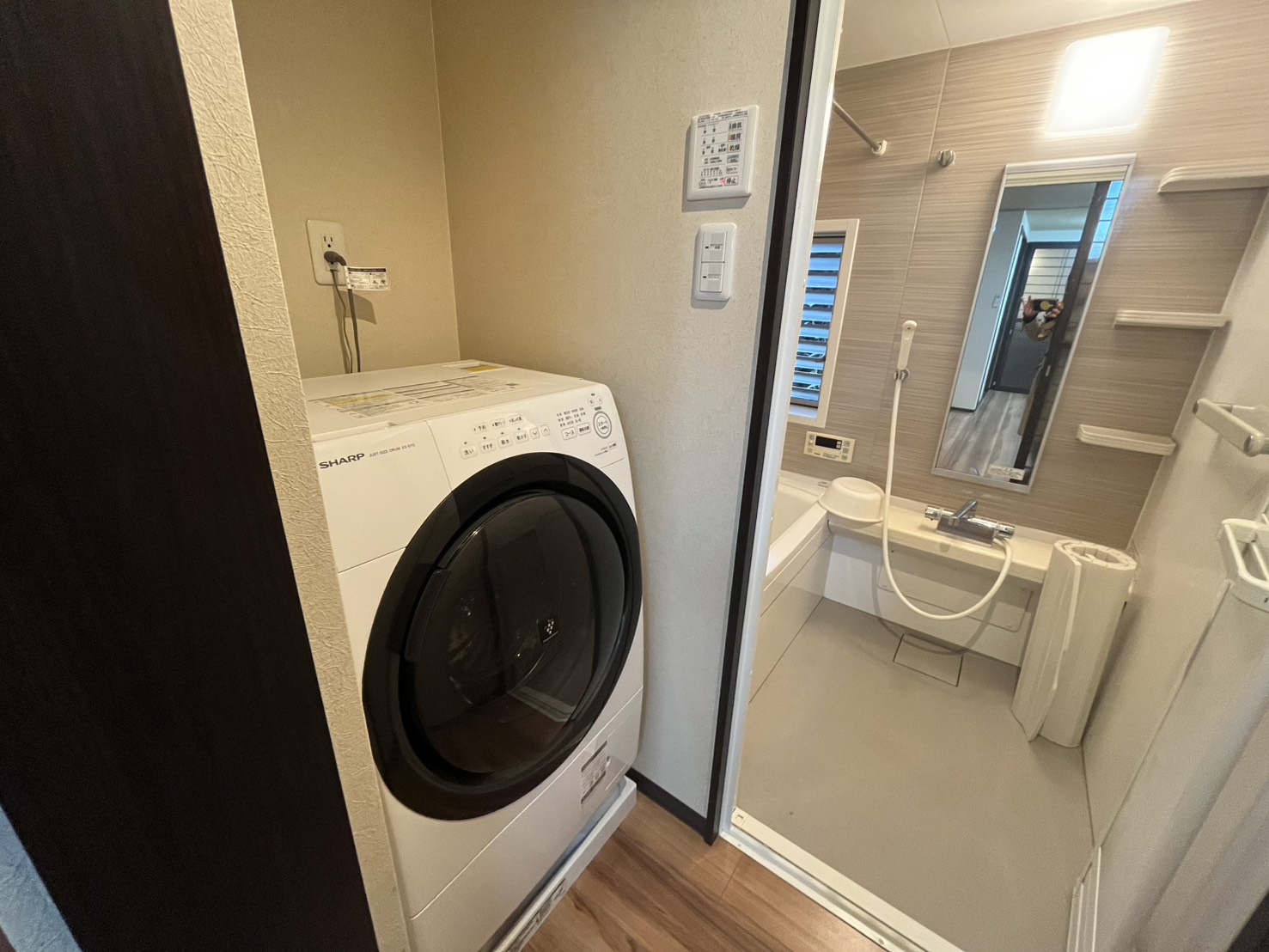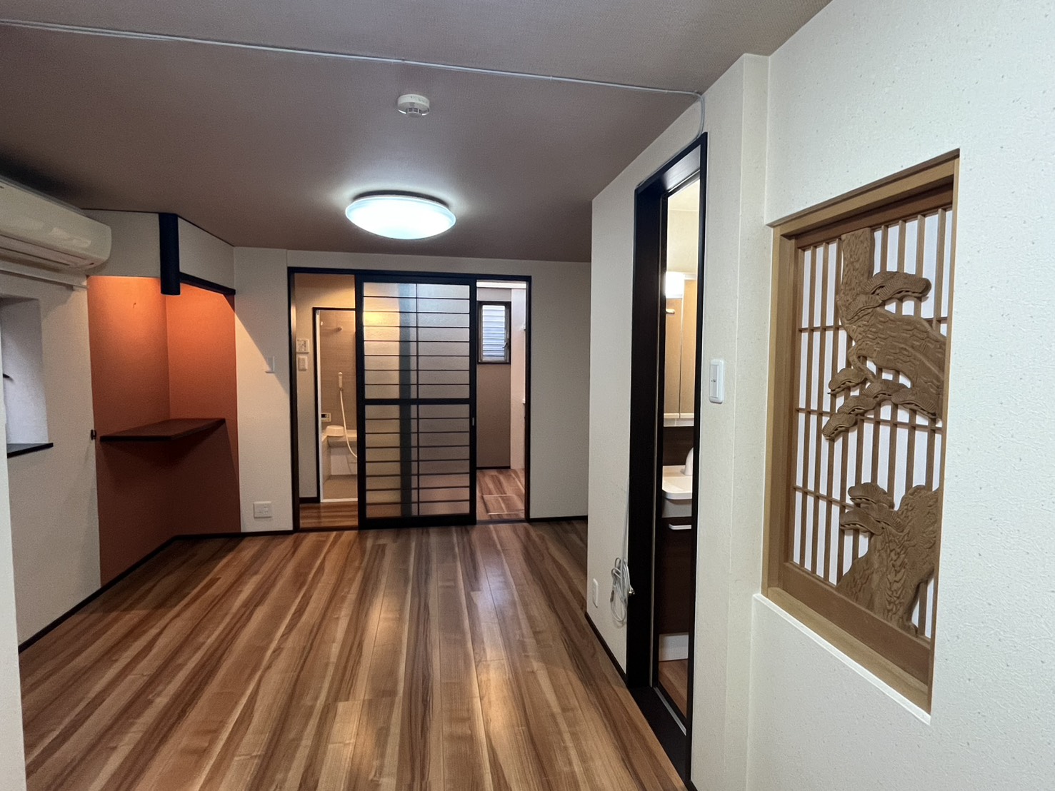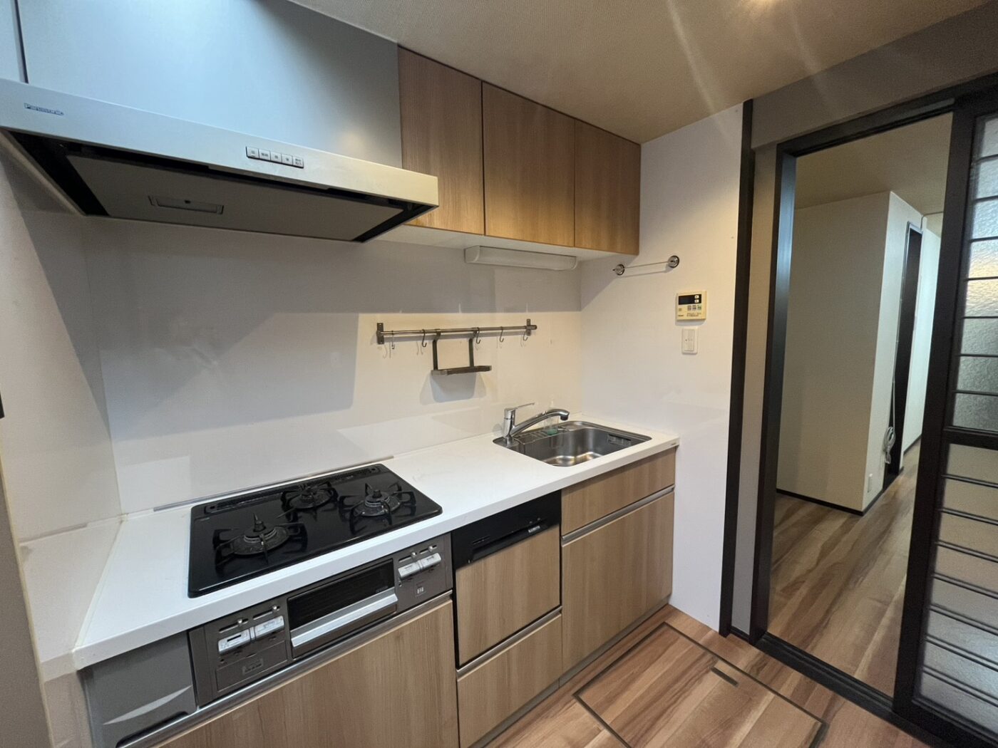 リビングの奥には、キッチンと洗濯機置き場とお風呂があり、リビング中ほどにトイレと洗面があります。水回りは綺麗に改装されているので、どの年代の方も快適に使えそうです。