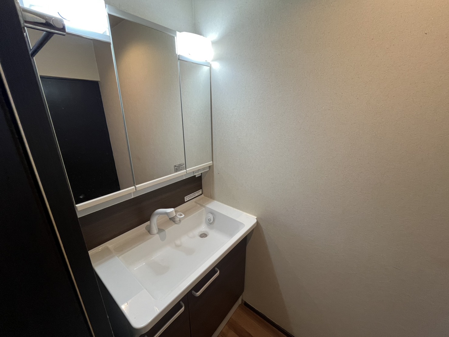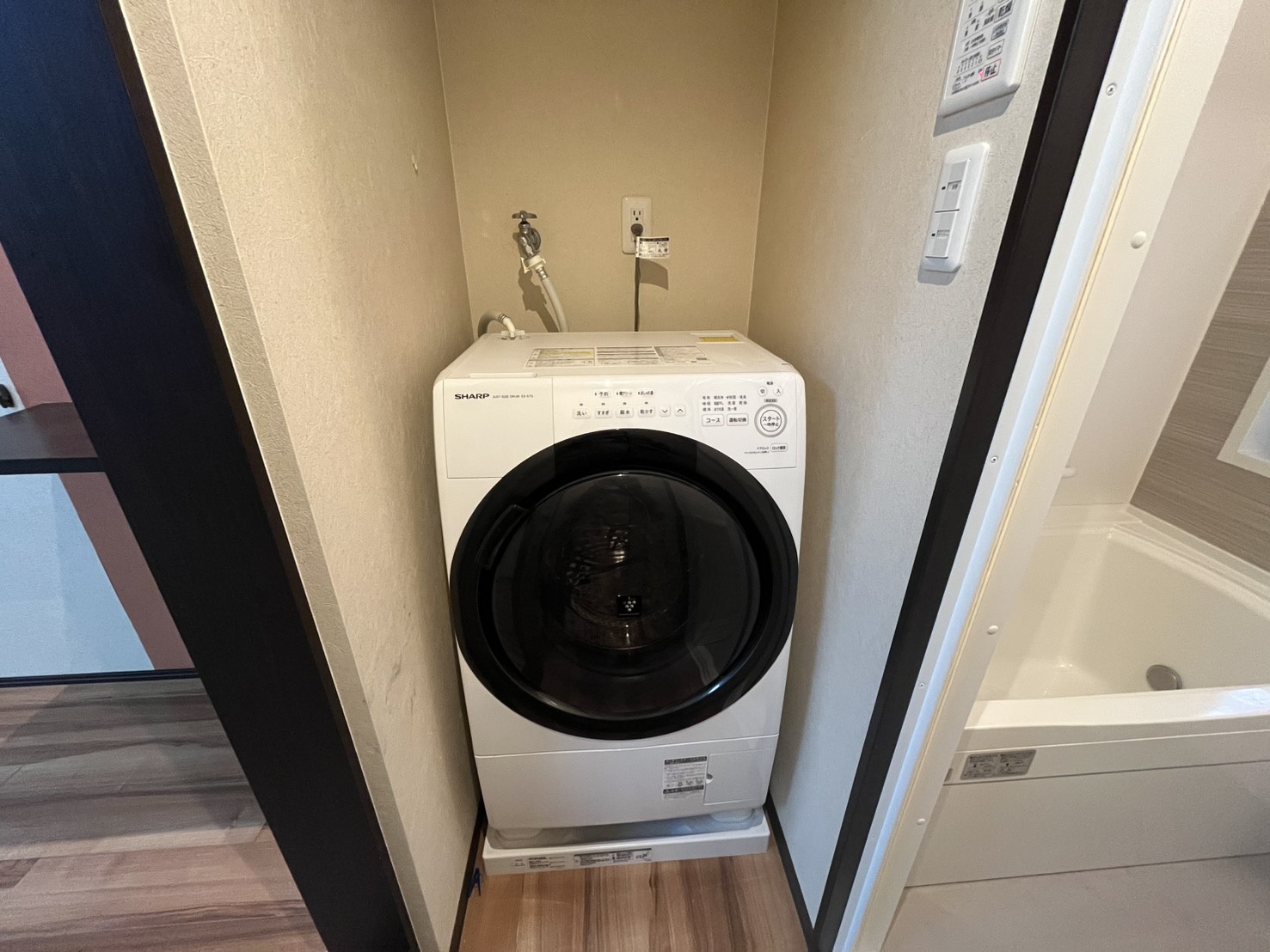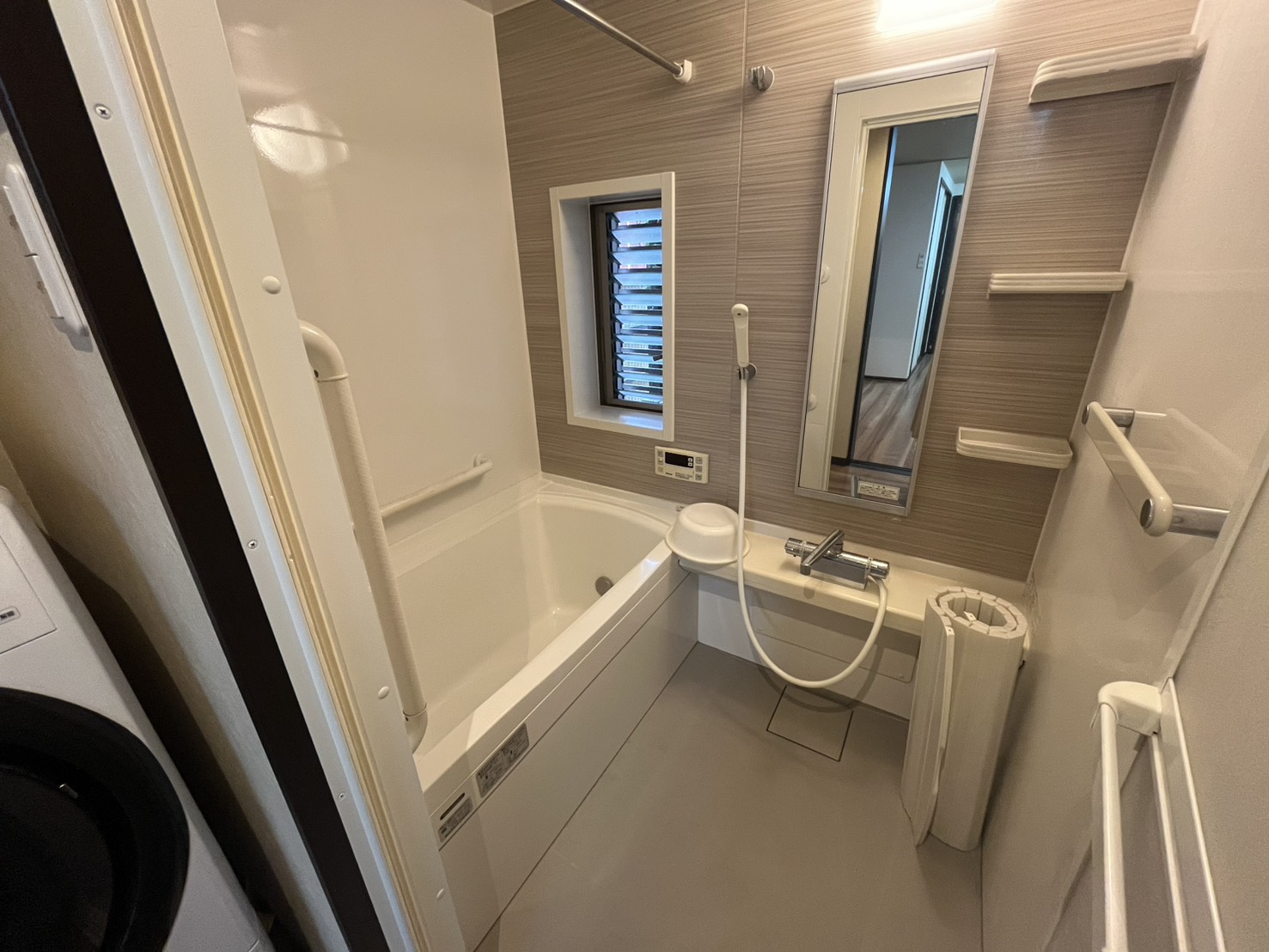 リビングの奥には、キッチンと洗濯機置き場とお風呂があり、リビング中ほどにトイレと洗面があります。水回りは綺麗に改装されているので、どの年代の方も快適に使えそうです。
