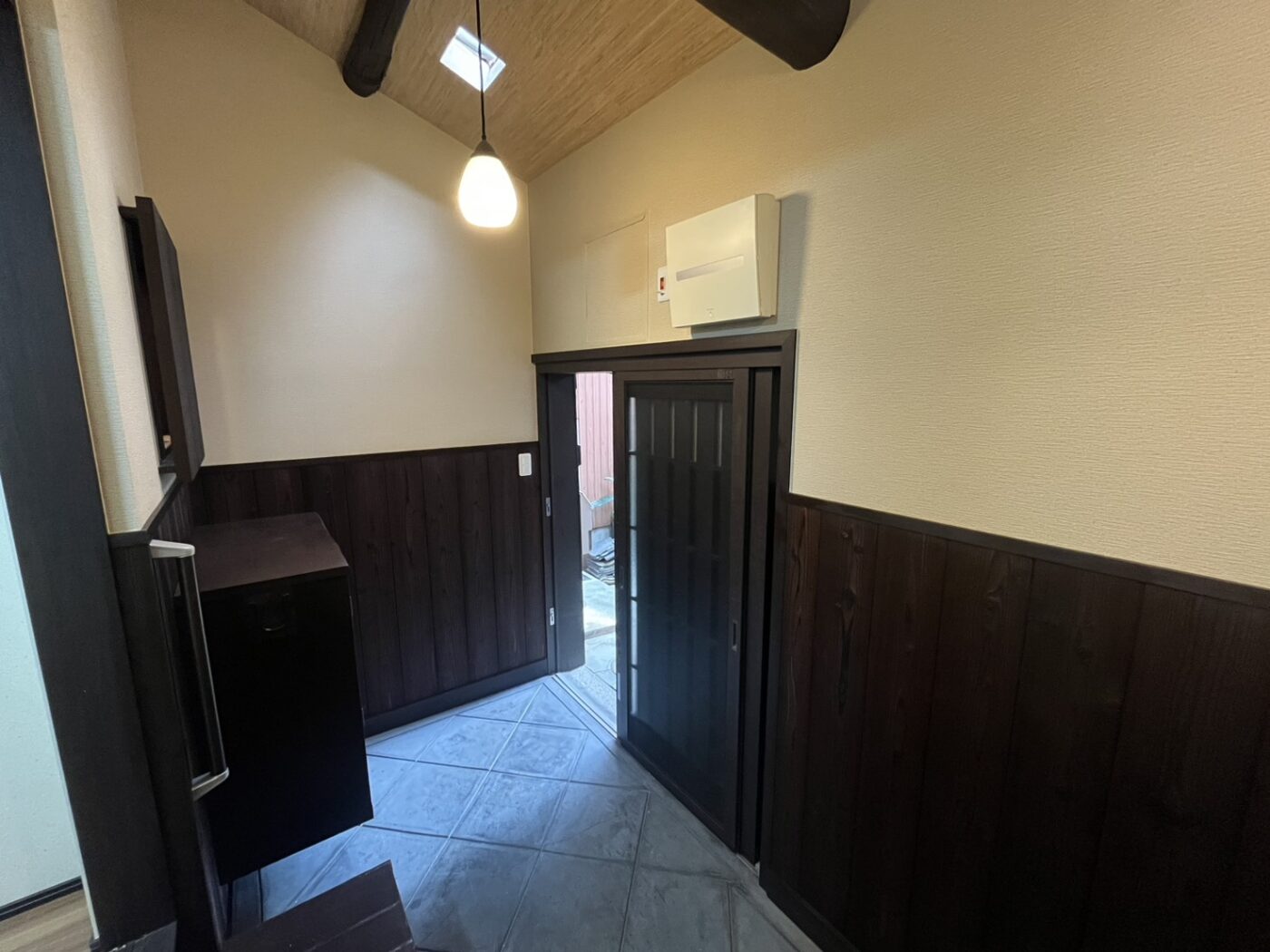 玄関を入ると古風な石畳とフローリングのリビングが広がります。