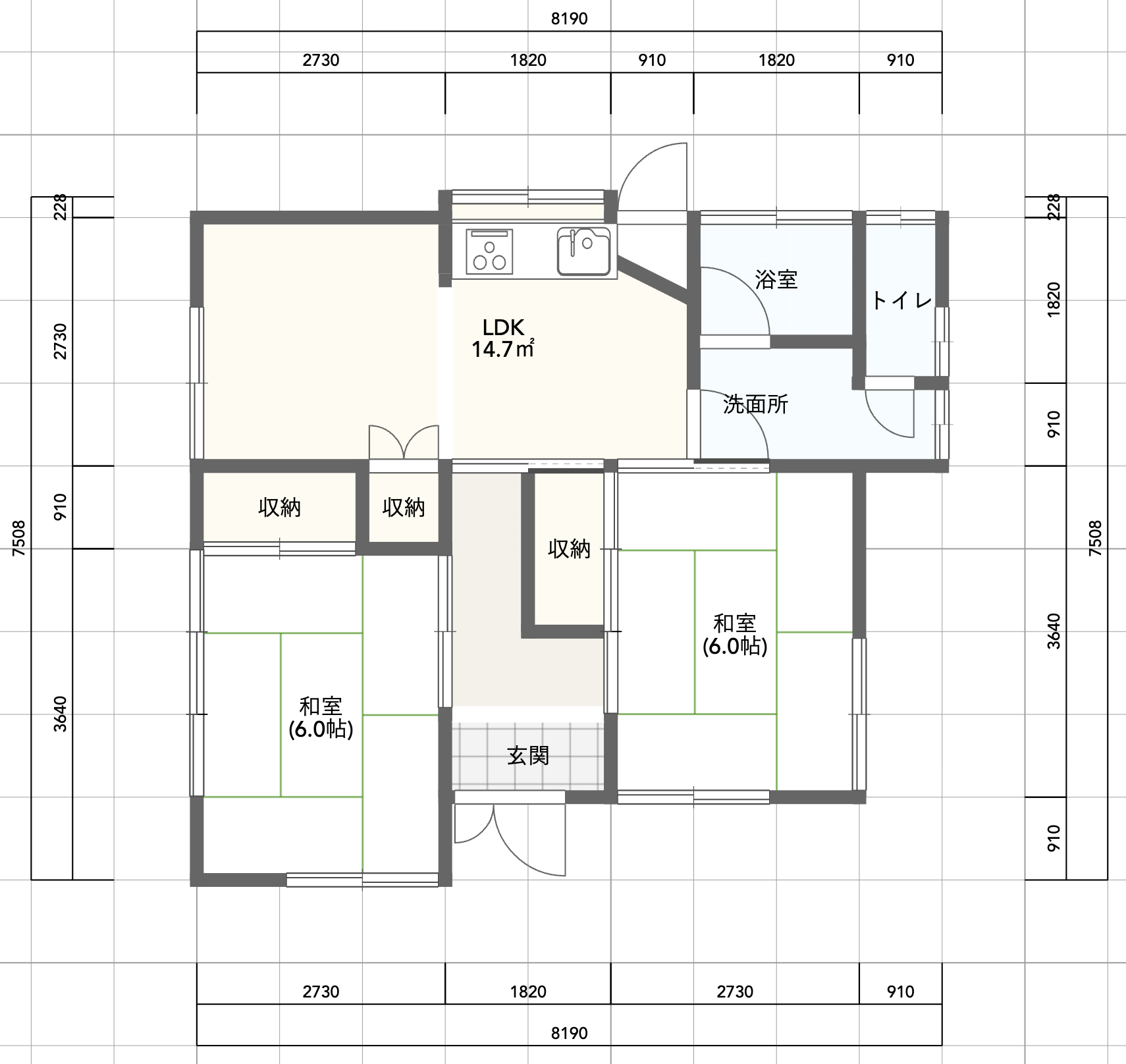 玄関から入ると廊下を挟んで右と左に和室があります。奥に進むと14.7㎡のLDKが。