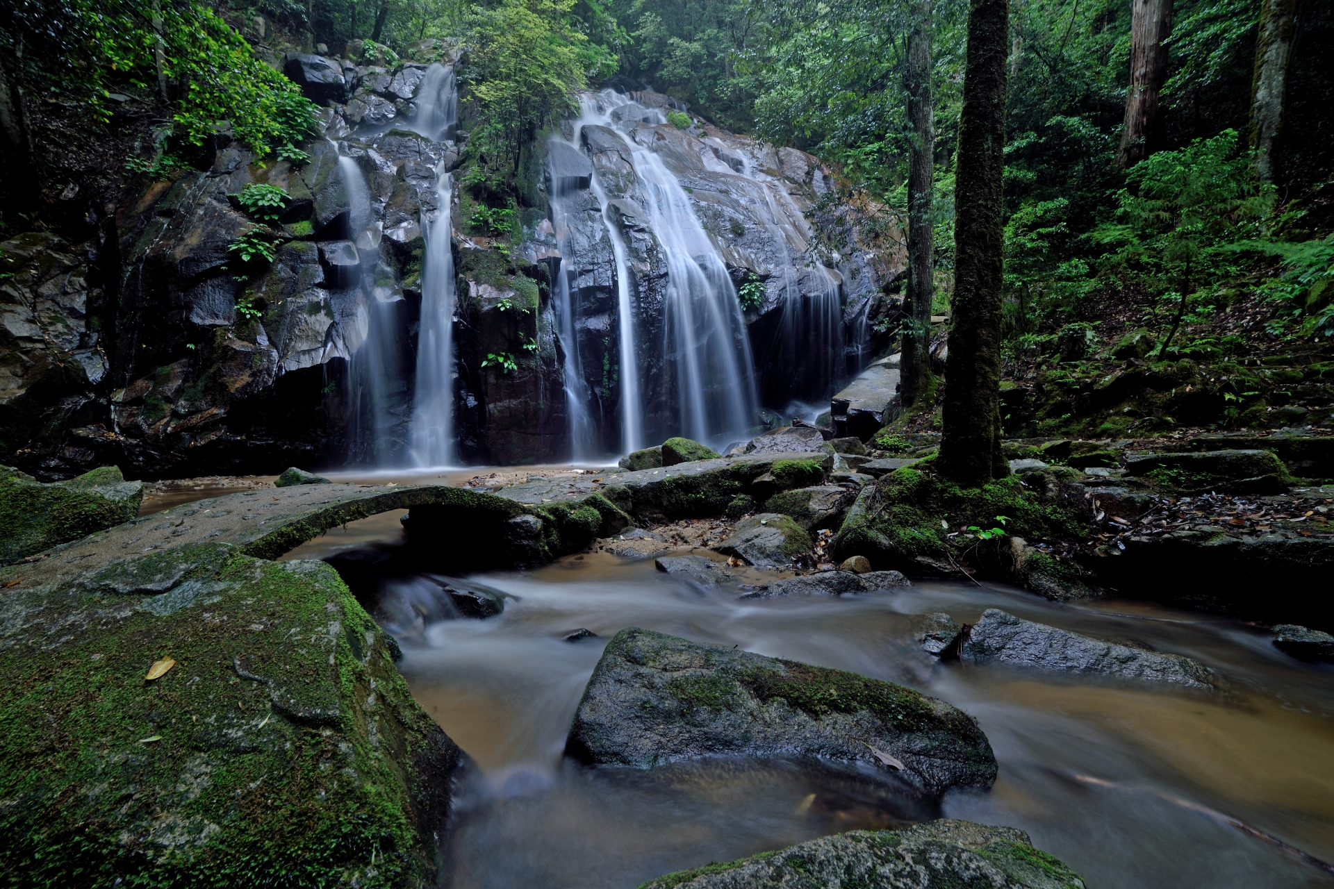 高さ約40m、幅約20mの雄大な滝は、左右に分かれて流れ落ちる様子から「男滝」「女滝」とも呼ばれ、一年を通して豊かな水量を誇ります。古くは修験道の聖地としても崇められ、滝の近くには不動尊が祀られており、その歴史が今も静かに伝えられています。