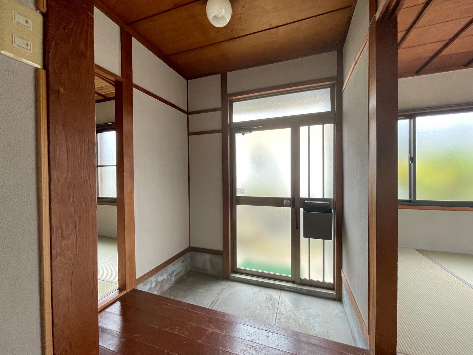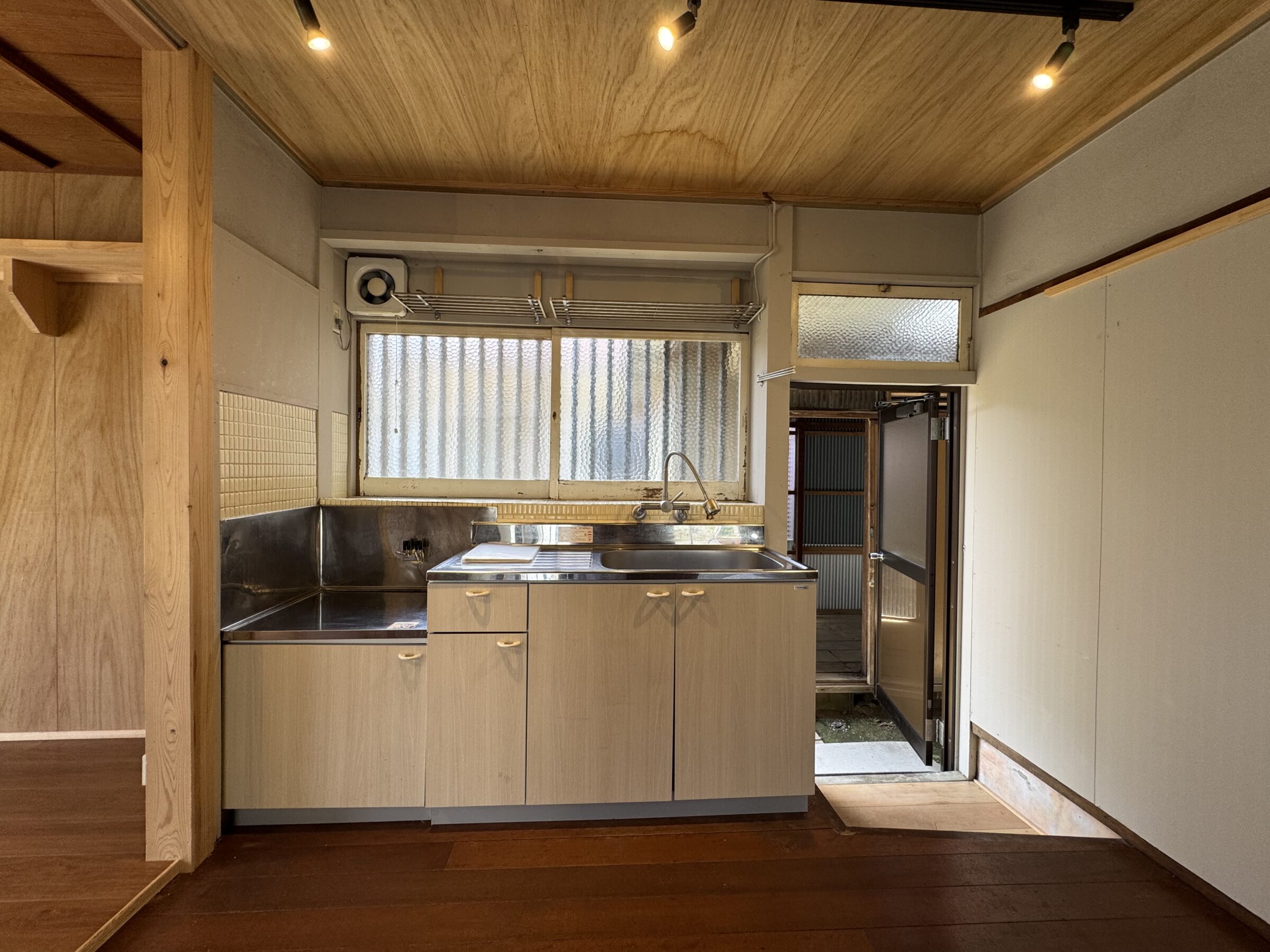 昔ながらのすりガラスから差し込む光が楽しみなキッチンです。キッチン横には取手口があるので、つっかけをはいて、家庭菜園用のコンポストにそのまま、野菜くずを運べそう。