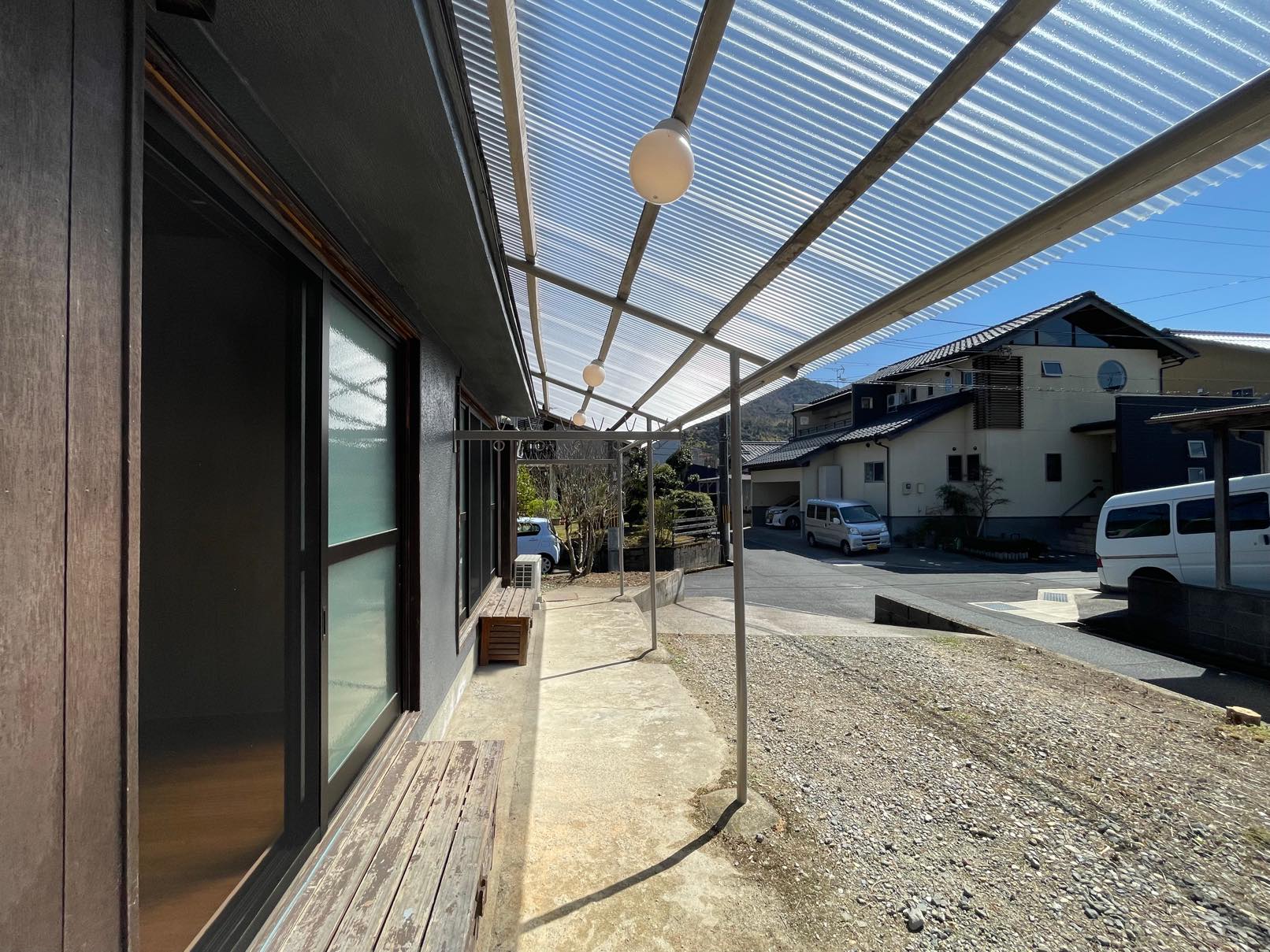 外に出ると、ひさしがあるので洗濯物も良く乾きます。家の前にはこじんまりですが庭になるスペースも。土を入れて小さな家庭菜園を始めるにも良さそうなスペースです。