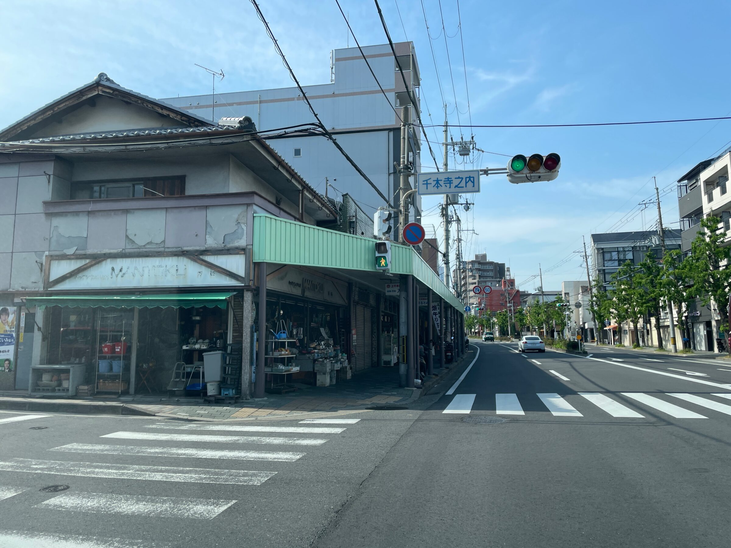 ”らしさ”を感じる雰囲気の寺之内通りに面する物件。すぐ東には主要道路の千本通りがあり、商店街になっています。駅が徒歩圏内ではないので少し不便ではありますがバスは充実。周辺は生活施設が揃っているので自転車1台あれば困らないでしょう。近くには北野天満宮(”天神さん”)や千本釈迦堂があり、天神さんは毎月25日は縁日で露天もでます。千本釈迦堂では冬に大根炊きがあったりと地元のイベントが豊富な地域です。