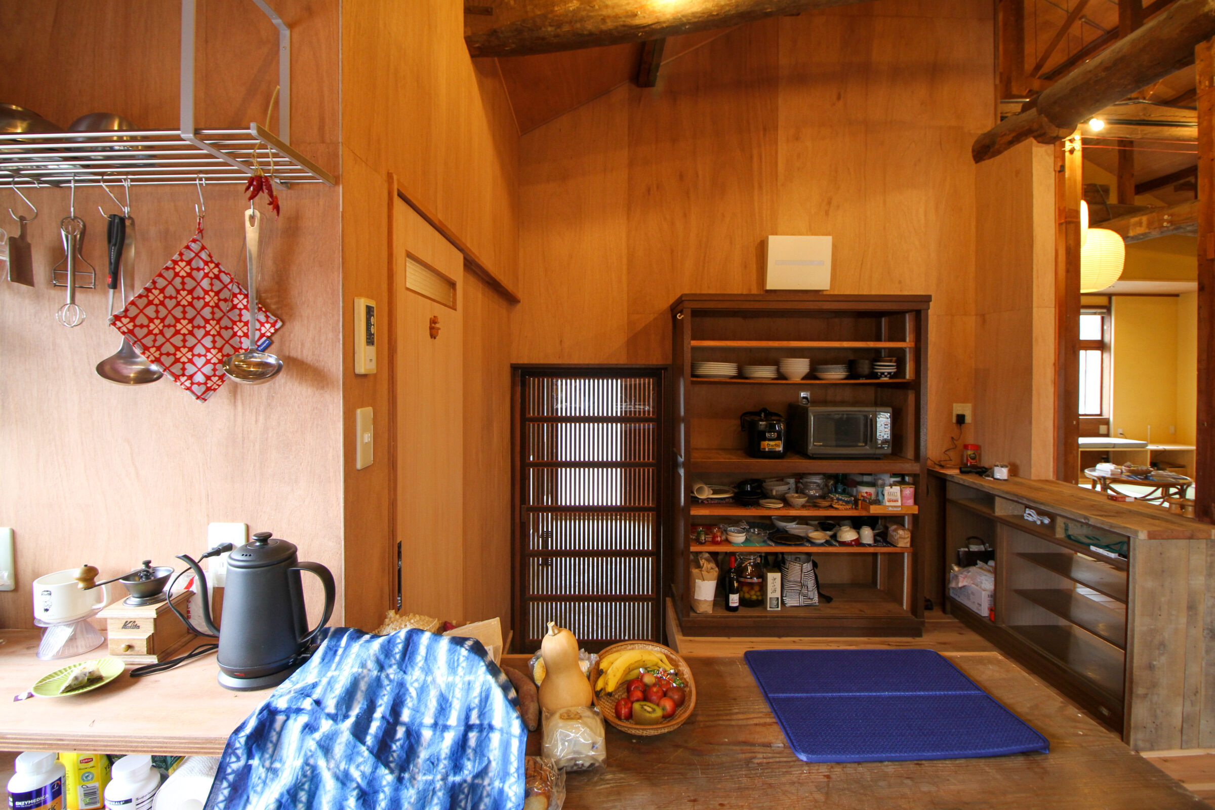 玄関を入るとまず大きい土間があり、そこから和室とキッチンに続きます。キッチンからは大きな梁の天井が見え、なんとも素敵な空間です。シェアハウスなのでみんなで気持ちよくキッチンを使えるような工夫も随所にされています。食器も昔ながらの食器棚に気持ちよく収納されています。