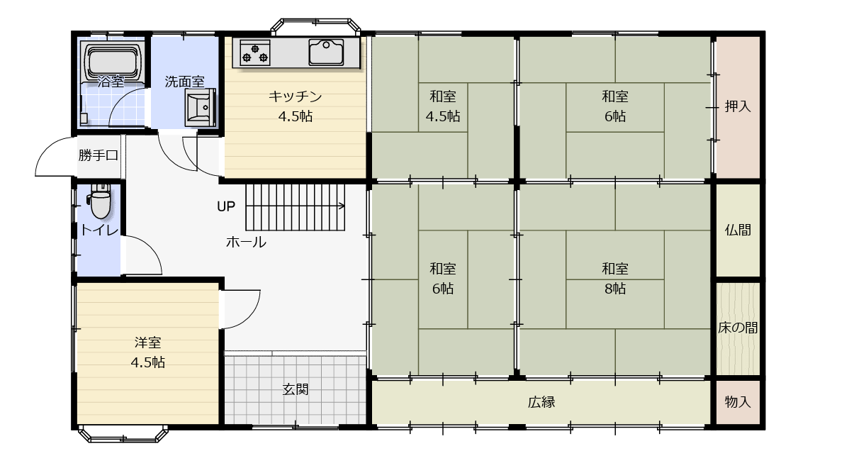 1階には、和室など4部屋が田の字型に繋がっていて、仕切りの襖を除けば広く使うこともできます。また和室の1室は、仏間・床の間付き。季節の花を床の間に飾るなどすれば、四季折々で心豊かに過ごせるでしょう。