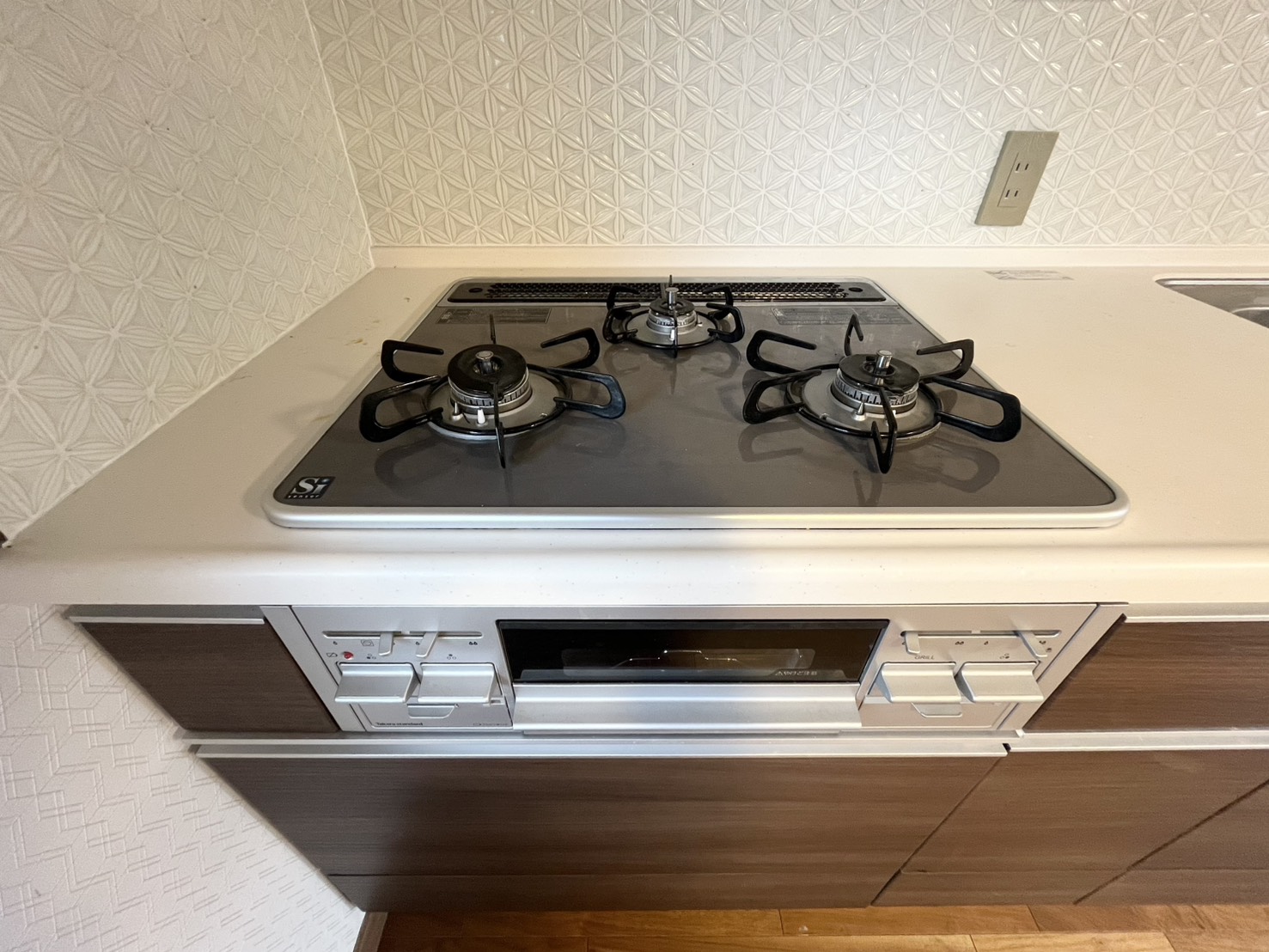 キッチンには、自炊派の方にはありがたいグリル付き3口コンロも備わっており、作業スペースもちゃんとあります。賃貸物件でこの大きさのキッチンは嬉しいですね。