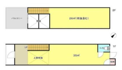 1階は35㎡のスペースとトイレが1つ、階段をあがった2階は26㎡のロフトっぽい部屋のみというシンプルな間取りです。