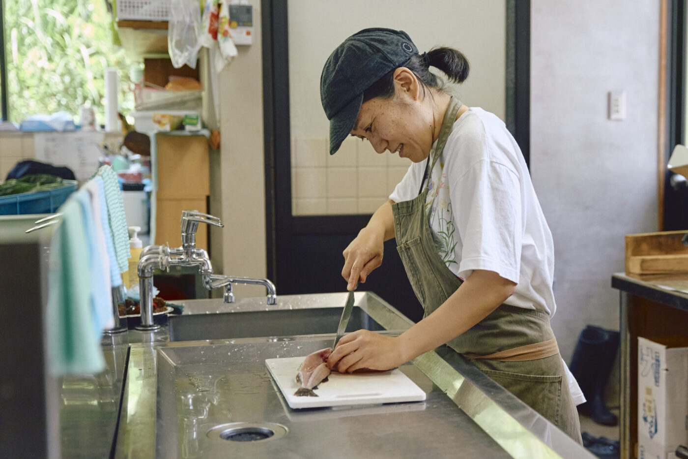 現在は、宿泊客の食事やツアー参加者用のお弁当作りを中心に、山の家の清掃や川魚の養殖、冒険学校のサポートなど幅広い業務に関わっているのだそう。多いときには60食以上のお弁当を準備することもあり、厨房に立つ時間は早朝5時から始まることも。「大変なときもありますが、岡や工場の方にも手伝ってもらいながら、お客様の食事時間に間に合うように仕事をしています」と笑います。